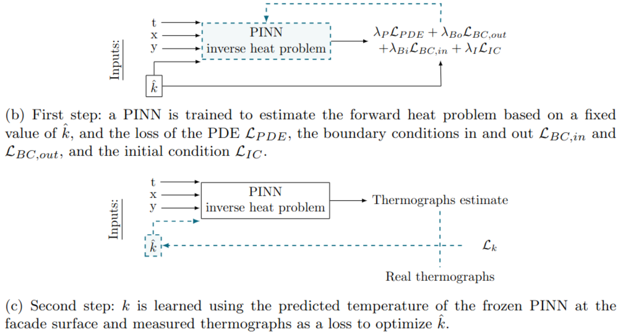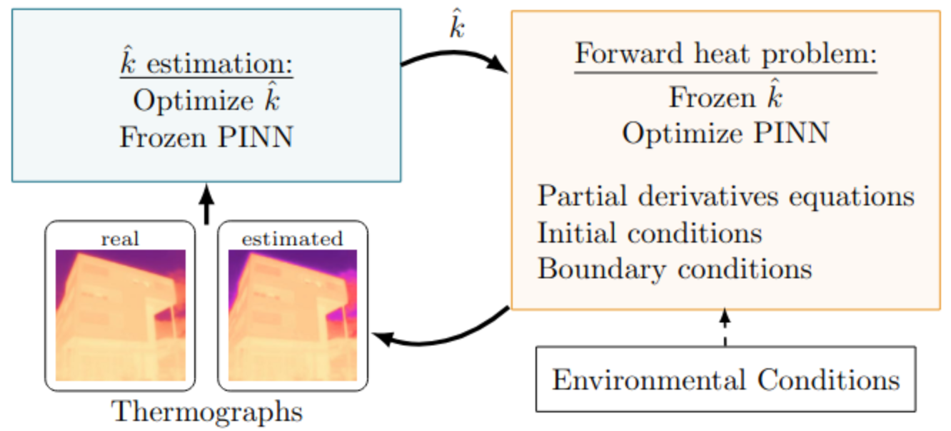 - Forward Heat Problem Learning: A PINN is trained to approximate the temperature distribution within the wall for a fixed estimated conductivity (), using the heat equation, Neumann boundary conditions, and environmental measurements as constraints.